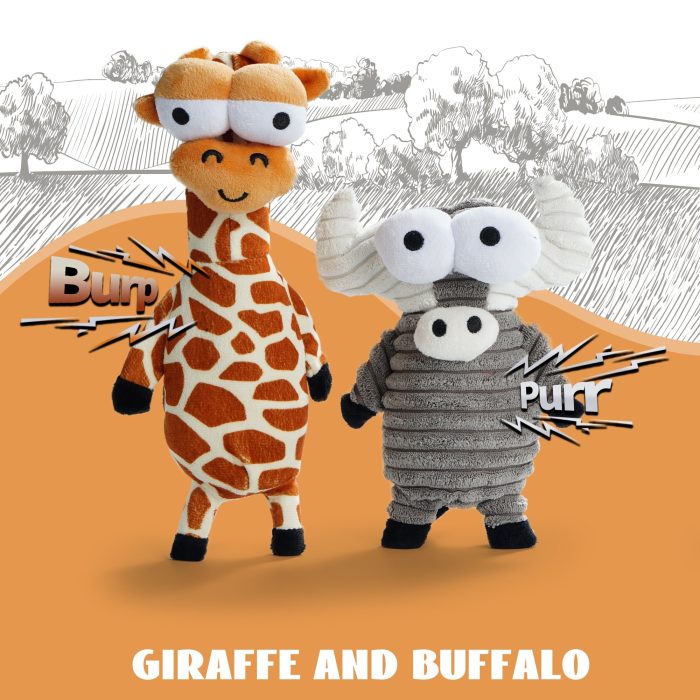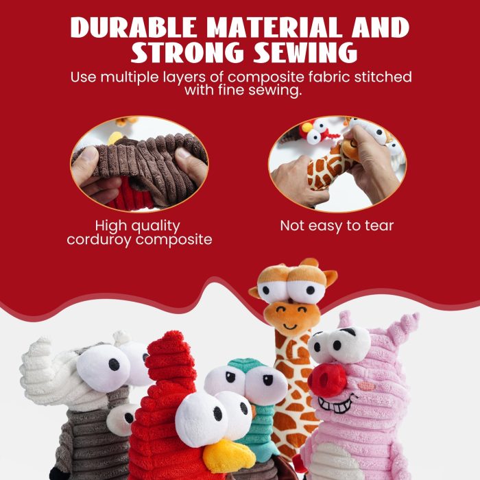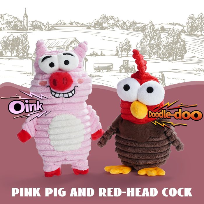 • This set includes five charming dog toys – Red-head Chicken, Pink Pig, Giraffe, Buffalo, and Mallard. Each toy is thoughtfully designed with a unique built-in squeaker, ensuring a variety of engaging sounds for your playful pup.