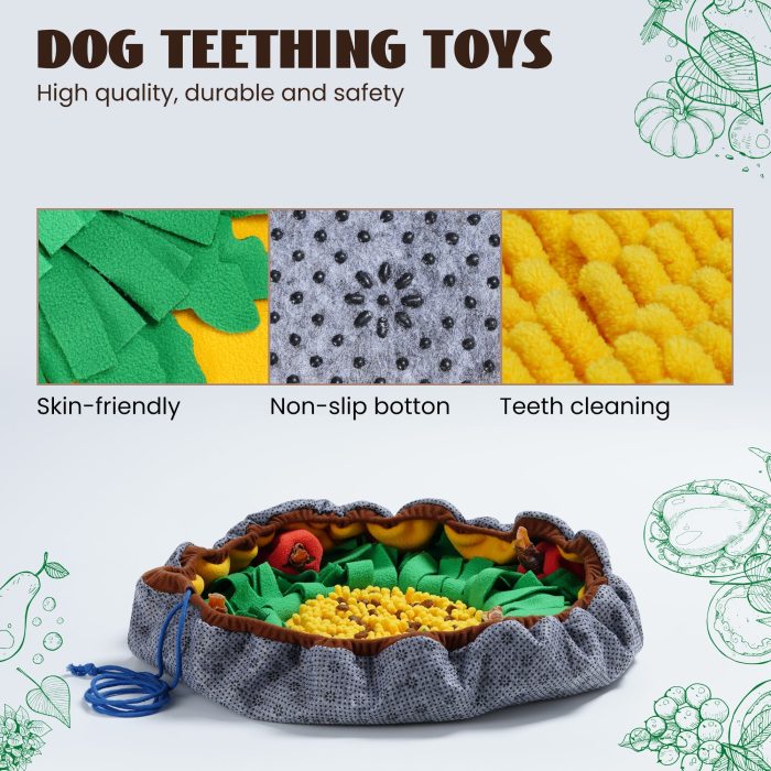 • The snuffle mat is designed to challenge your dog’s keen sense of smell, encouraging them to find hidden treats or toys beneath soft felt strips. This engages their mind and body, preventing boredom and promoting overall well-being.
